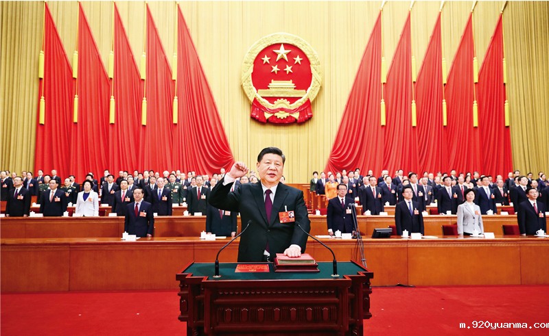 2018年3月17日,十三届全国人大一次会议在北京人民大会堂举行第五次全体会议。习近平当选中华人民共和国主席、中华人民共和国中央军事委员会主席。这是习近平进行宪法宣誓。 新华社记者 鞠鹏/摄