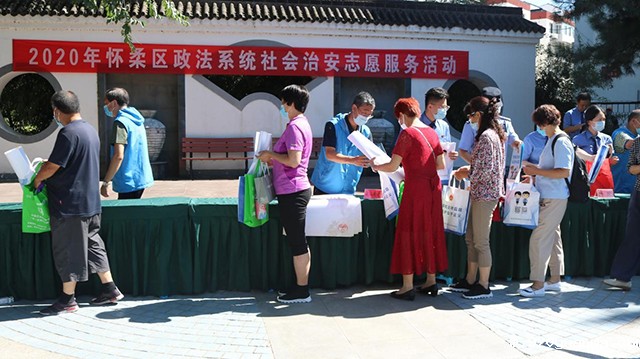 8月10日,区法学会助力怀柔区委政法委联合区公安分局、区检察院、区法院、区司法局等单位,在龙山街道龙湖新村社区,开展2020年怀柔区政法系统社会治安志愿服务活动。