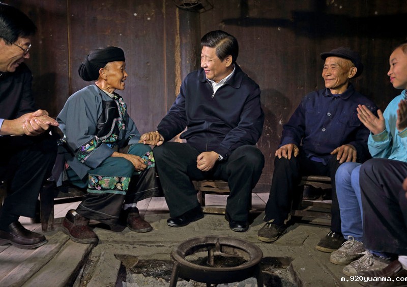 2013年11月3日,习近平在湖南省湘西土家族苗族自治州花垣县十八洞村苗族村民石拔三家中同一家人促膝交谈。新华社记者 兰红光 摄
