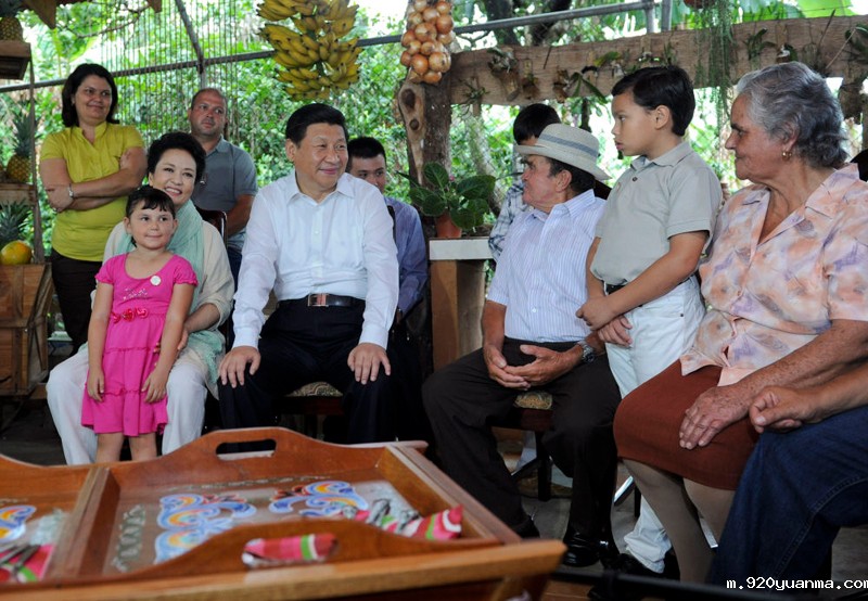 2013年6月3日,正在哥斯达黎加进行国事访问的习近平和夫人彭丽媛走访当地农户萨莫拉一家,与他们亲切交流。新华社发(张铎 摄)