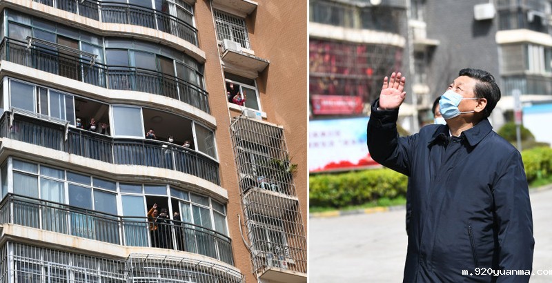 2020年3月10日,习近平专门赴湖北省武汉市考察新冠肺炎疫情防控工作。这是习近平在东湖新城社区考察时,向在家隔离居住的居民挥手致意、表示慰问(拼版照片)。新华社记者 谢环驰 摄